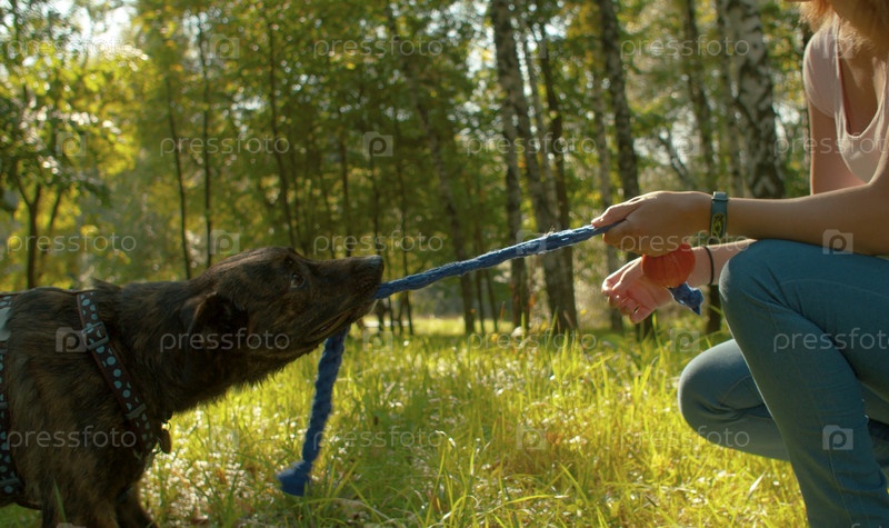 Собаки сталкиваются с игрушкой в зубах