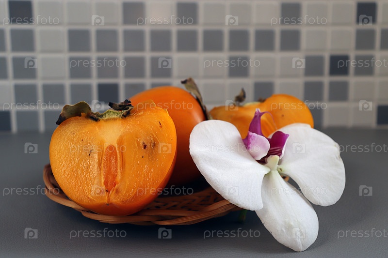 Хурма и цветок орхидеи на столе в плетеной корзинке. Фрукт в разрезе