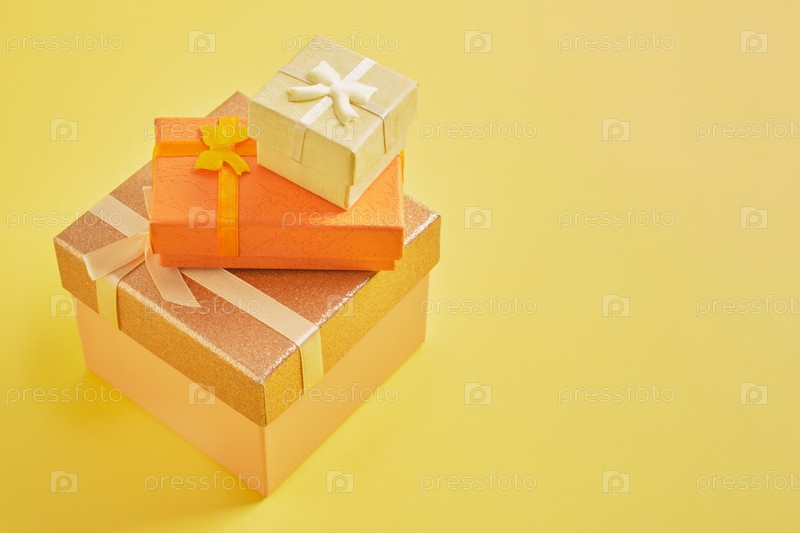 Подарочные коробки разных цветов, размеров и форм на желтом фоне копией пространства