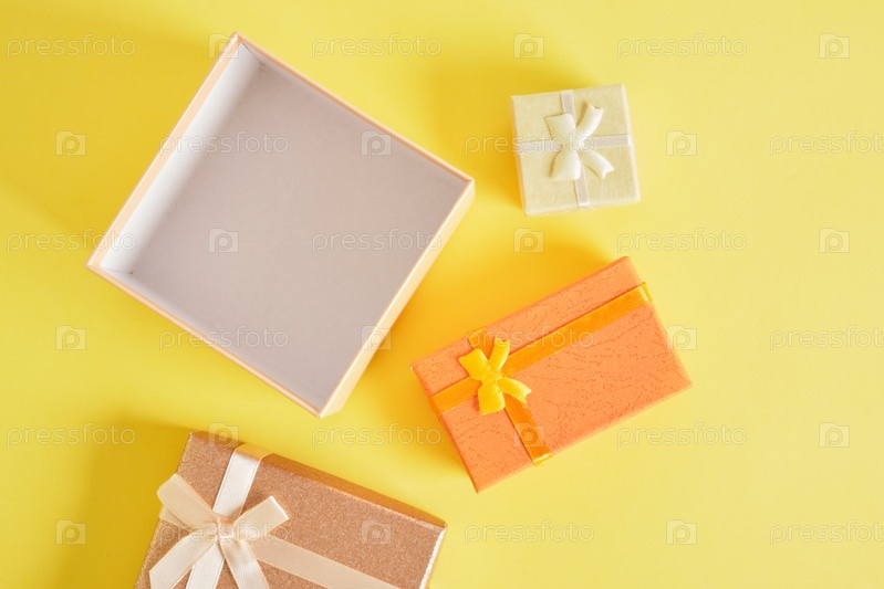 Подарочные коробки разных цветов, размеров и форм на желтом фоне, картонные коробки с крышками и бантами