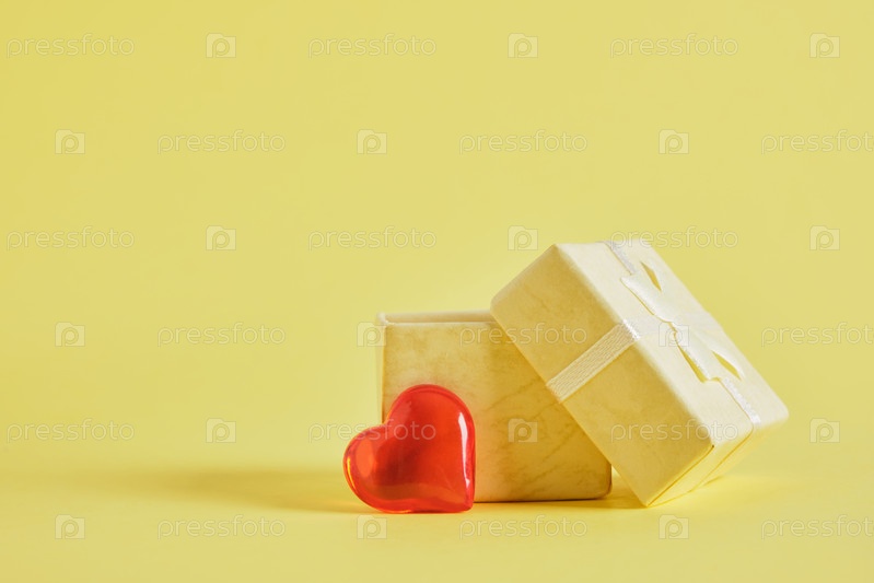 Маленькое красное улыбающееся сердце и открытая желтая подарочная коробка на желтом фоне