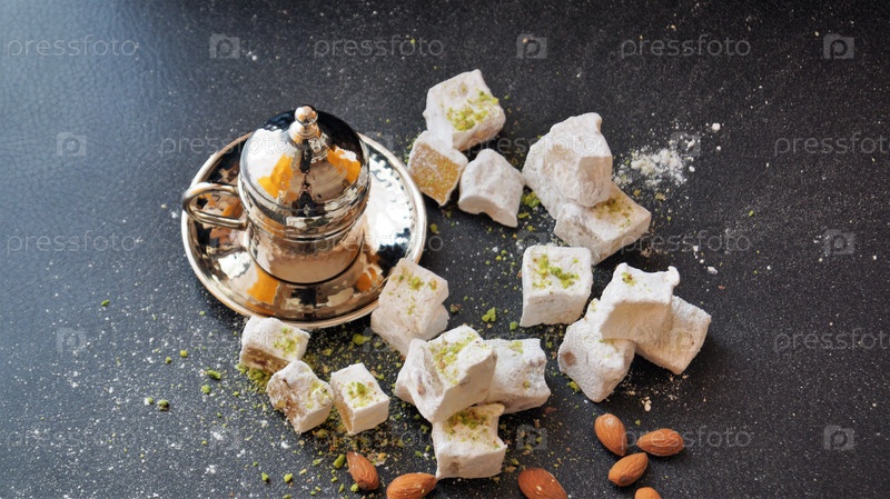 Турецкий кофе, лукум и орехи на черном фоне