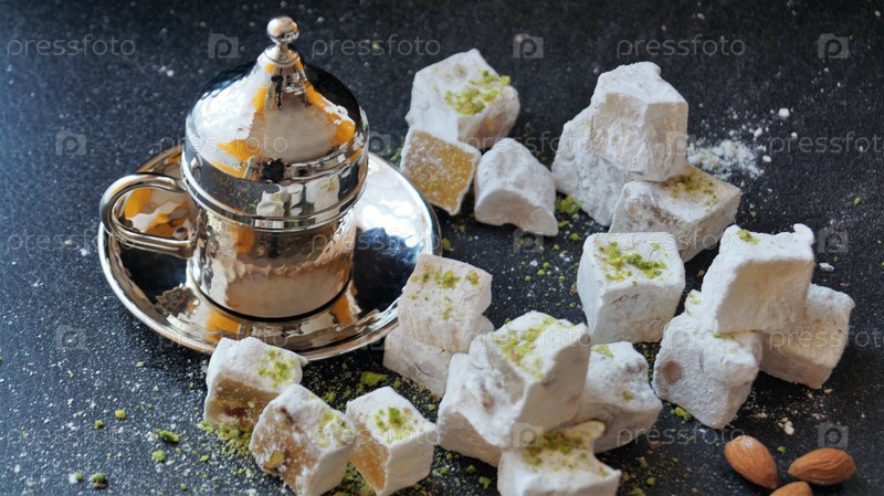 Турецкий кофе, лукум и орехи на черном фоне