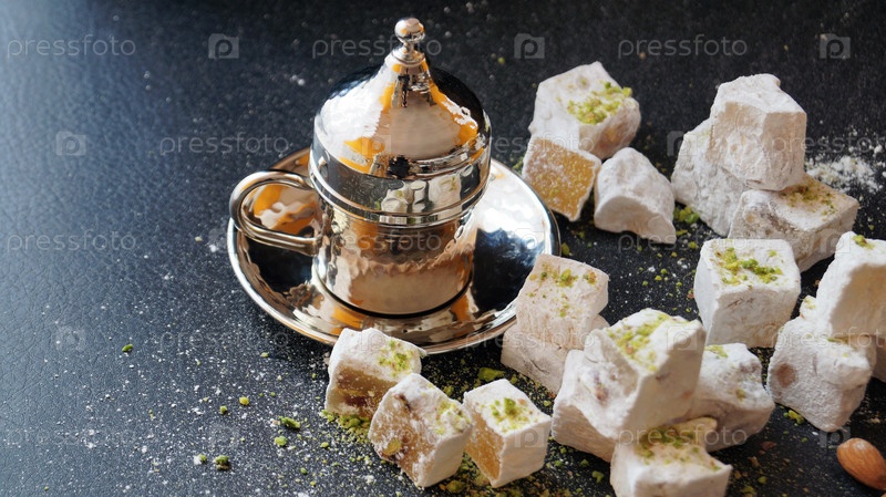 Турецкий кофе, лукум и орехи на черном фоне