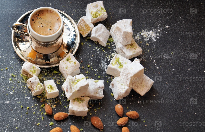 Турецкий кофе, лукум и орехи на черном фоне