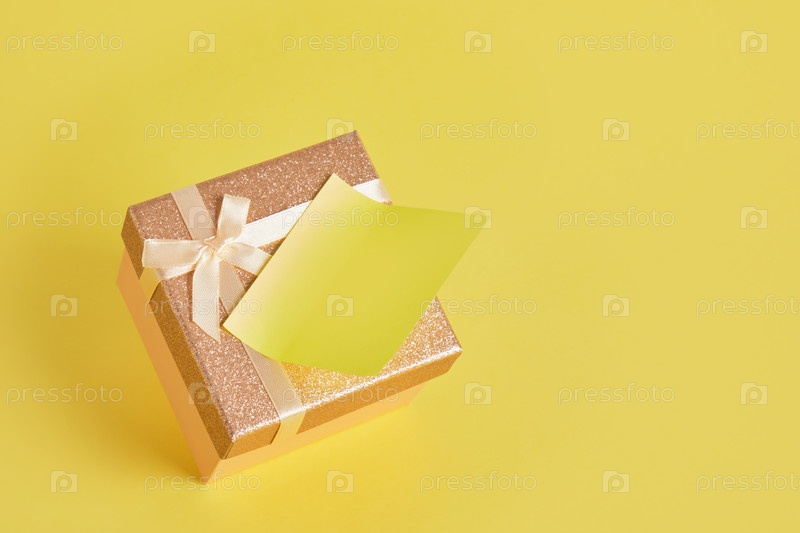 Блестящая розовая квадратная подарочная коробка на желтом фоне с наклейкой для заметок, приклеенной к крышке
