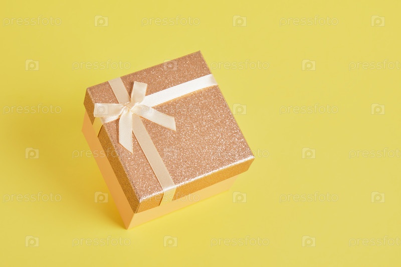 Блестящая розовая квадратная подарочная коробка на желтом фоне