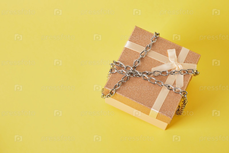 Блестящая розовая квадратная подарочная коробка, перевязанная цепью на желтом фоне