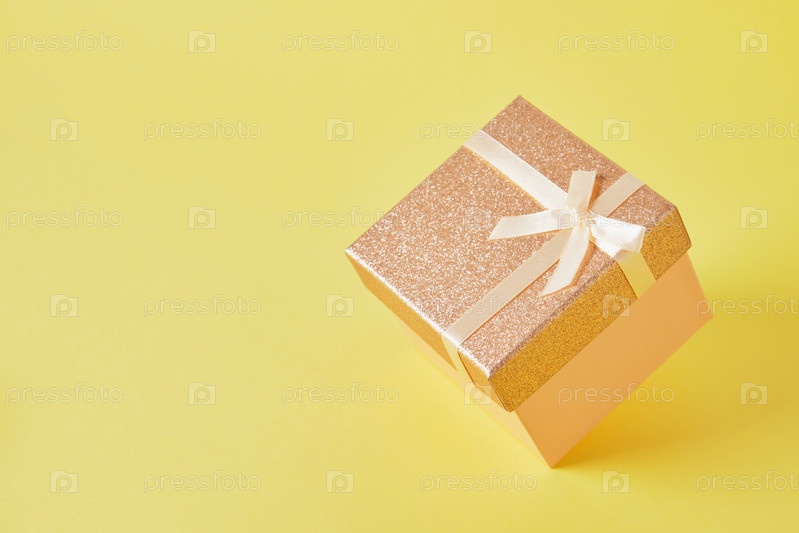 Блестящая розовая квадратная подарочная коробка на желтом фоне