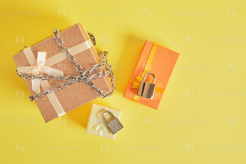 Блестящая розовая подарочная коробка, обернутая цепочкой на желтом фоне, подарочные коробки и замки, защита подарков. запрет на открытие