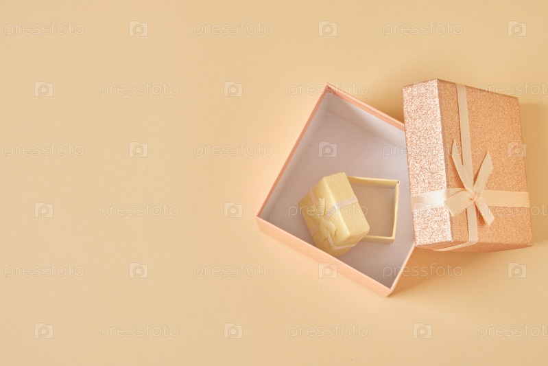 Маленькая желтая подарочная коробка в открытой розовой блестящей подарочной коробке на бежевом фоне