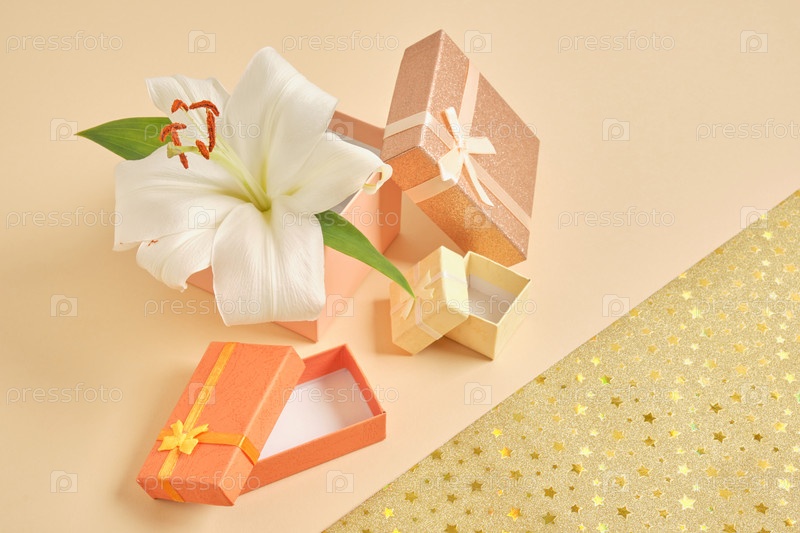 Цветок лилии и подарочные коробки разных цветов, размеров и форм цвета на бежевом фоне