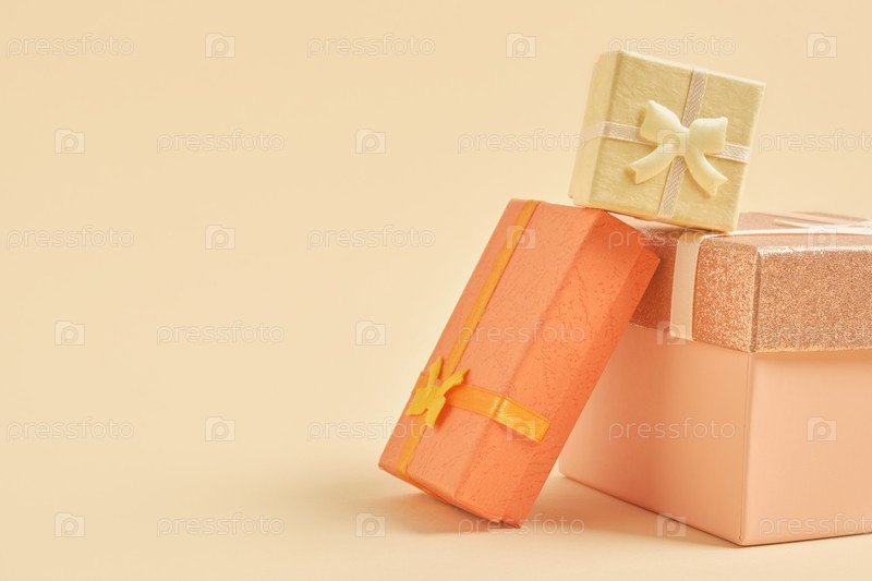Композиция с подарочными коробками и пастельным фоном, трендовые цвета, подарочные коробки разных цветов, размеров и форм