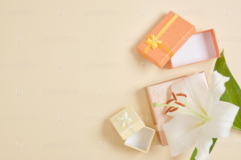 Цветок лилии и подарочные коробки разных цветов, размеров и форм цвета на бежевом фоне