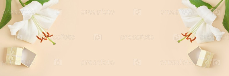 Цветок лилии и маленькая открытая желтая подарочная коробка на бежевом фоне