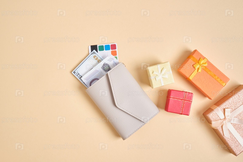 Кошелек, кредитная карта, деньги и маленькие коробки подарков на бежевом фоне