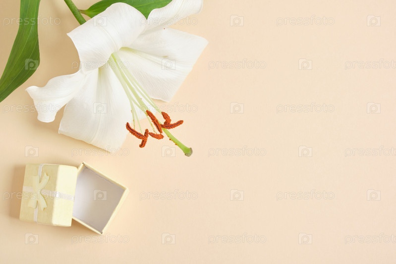 Цветок лилии и маленькая открытая желтая подарочная коробка на бежевом фоне