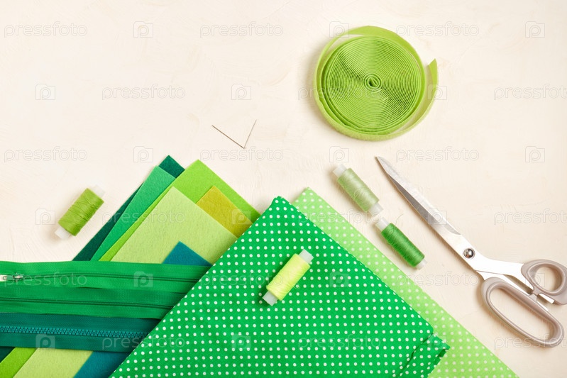 Фетр, принадлежности для шитья и рукоделия на столе, оттенки зеленого