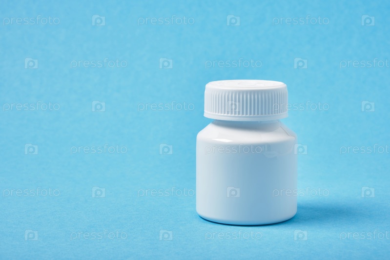 Бутылка с белой таблеткой медицины на синем фоне