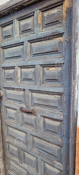 Старая деревянная дверь со следами старой краски и ржавой ручкой