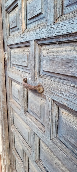 Старая деревянная дверь со следами старой краски и ржавой ручкой