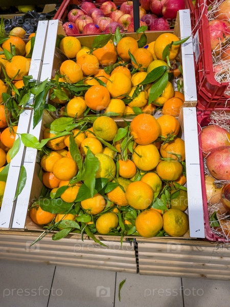 Мандарины с веточками в ящике в магазине
