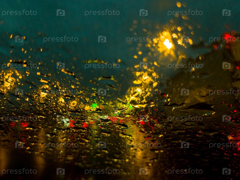 Капли дождя на лобовом стекле автомобиля. Движение большое, отражаются огни машин