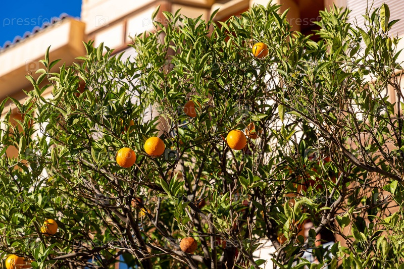 Апельсины растут на дереве в саду возле дома