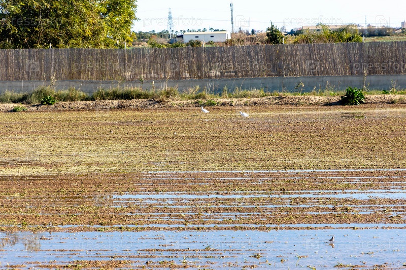 Цапли идут по рисовому полю, залитому водой