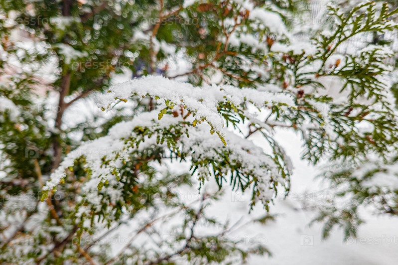 Свежий снег лежит на зеленых ветвях елей. Начало зимы