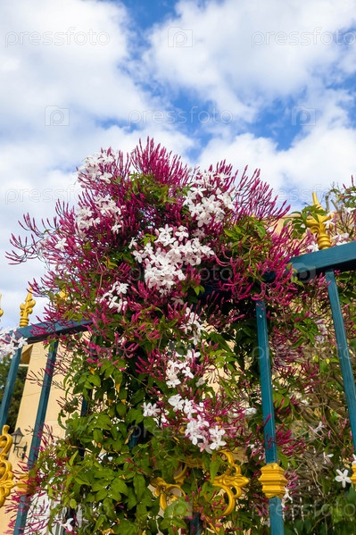 Многоцветный жасмин (Jasminum polyanthum) цветет на фоне синего забора