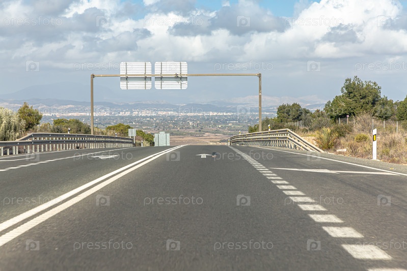 Пустая дорога через холмы. Город и горы видны на горизонте
