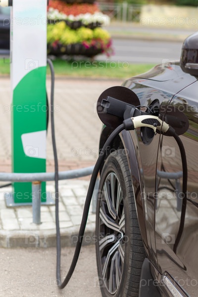 Источник питания подключается к электромобилю для зарядки аккумулятора. Зарядные технологии промышленного транспорта, которые являются футуристическими автомобилями. Топливо для электромобилей Подключите гибридный автомобиль