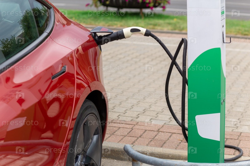 Источник питания подключается к электромобилю для зарядки аккумулятора