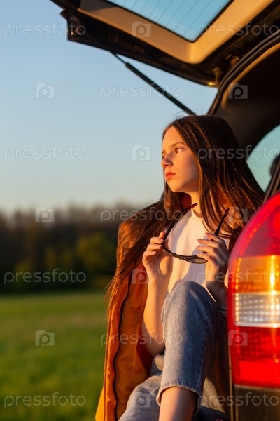 Довольно грустная девочка-подросток в солнцезащитных очках сидит одна в багажнике автомобиля