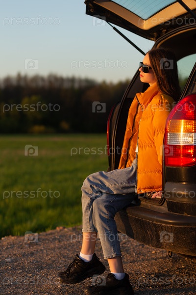 Довольно грустная девочка-подросток в солнцезащитных очках сидит одна в багажнике автомобиля
