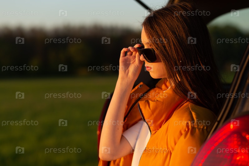Довольно грустная девочка-подросток в солнцезащитных очках сидит одна в багажнике автомобиля