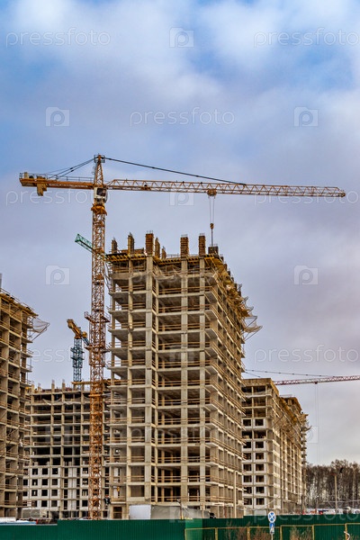Строительство третьей очереди нового жилого комплекса «В лесу». Работа строительных кранов, идет возведение стен зданий. Москва, Россия