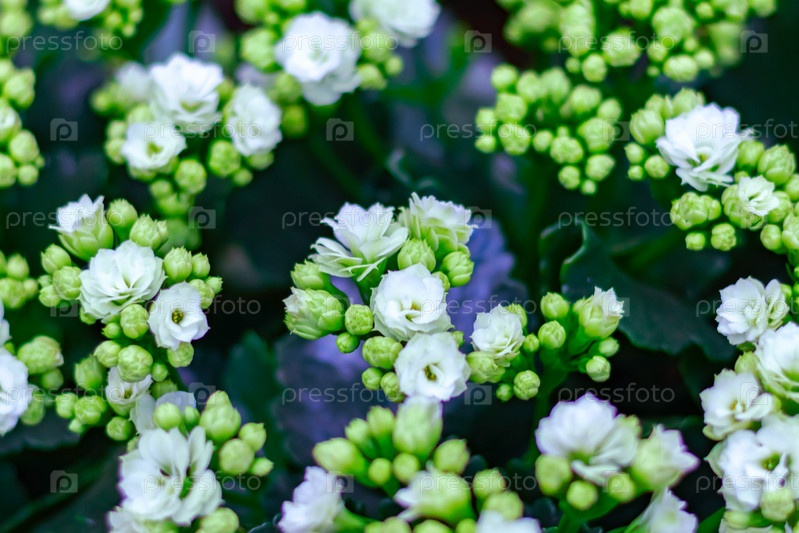 Красивый яркий каланхоэ blossfeldiana-Calandiva, цветочный букет каланхоэ кораллово-белые цветки. красочные маленькие цветы каланхоэ в крупном плане