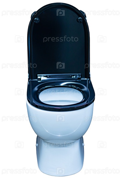 Новый белый компактный унитаз с черной крышкой, изолированный на белом фоне. крупным планом