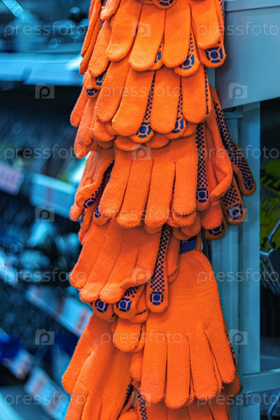 Торговля строительными перчатками. продажа перчаток для защиты рук в супермаркете. крупным планом