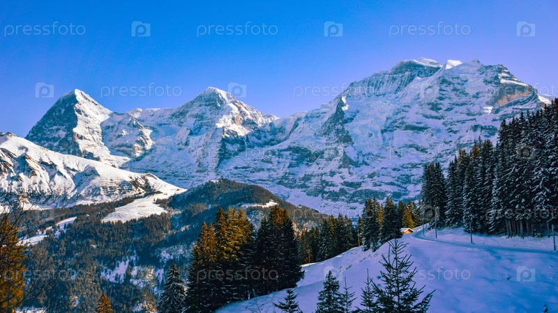 Горные вершины Юнгфрау, Эйгер и Монх зимой Швейцарские Альпы, Бернский Оберланд, Швейцария