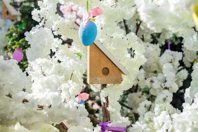 Деревянный домик для птиц на цветущей яблоне. Весеннее украшение сада и города