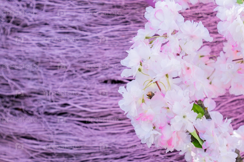 Искусственные ветки цветущей яблони на фоне фиолетового хвороста