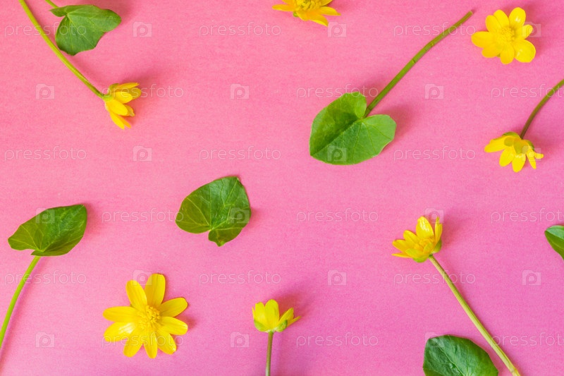 Ficaria verna на розовом фоне, первый весенний цветок, красочный узор