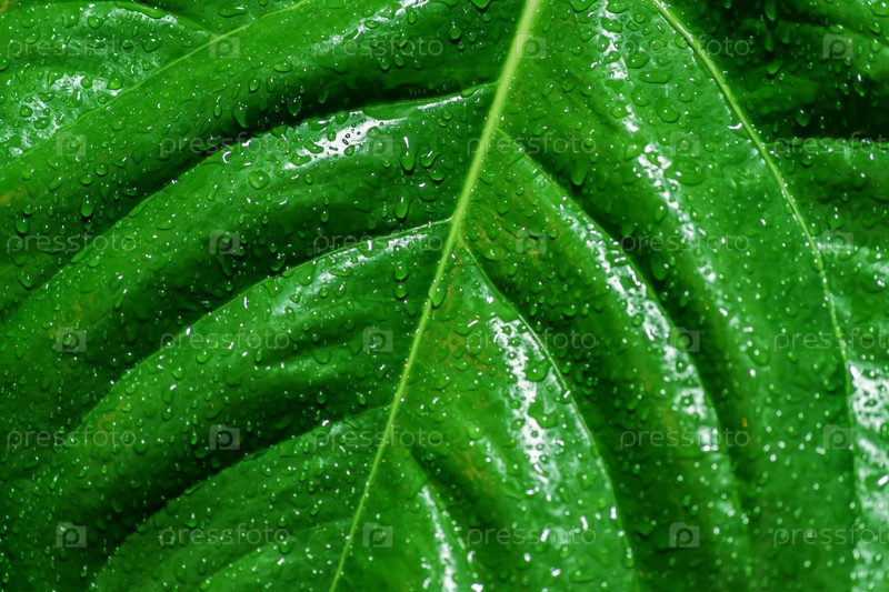 Фоновая текстура зеленого тропического листа с каплями воды после дождя