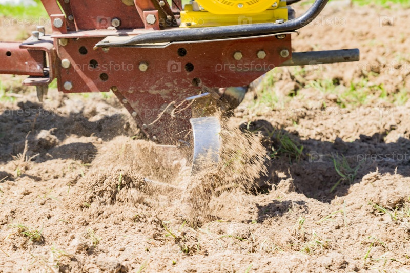 Крупный план трактора (мотоблока), вспахивающего поле