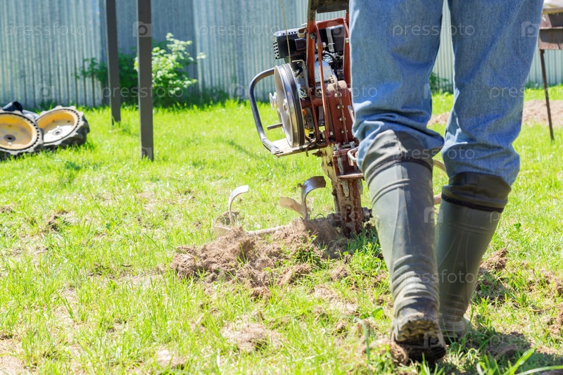 Мужчина в резиновых сапогах заводит трактор (мотоблок) для вспашки полей
