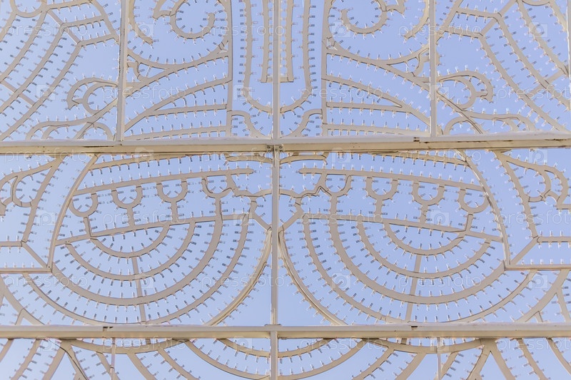 Металлическая конструкция со светодиодными огнями для освещения декора ночью на фоне голубого неба