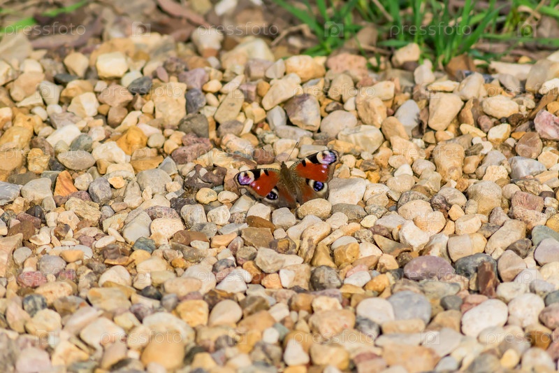 Дневная бабочка павлиний глаз сидит на гравийной дороге в солнечный день